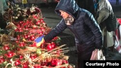 «Мы помним о Голодоморе, потому что он прошелся по моей семье, семье моих родственников», – говорит киевлянка Тамара Смеян. Она ставит лампадку со свечей и кладет у памятника несколько колосков пшеницы.