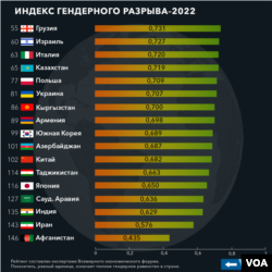 Индекс построен на базе показателей, оценивающих вовлеченность мужчин и женщин в экономическую деятельность страны, анализирующий их доступ к образованию, возможностям в сфере здравоохранения, а также их активность в политической жизни. В этом году индекс включает 146 государств. В рейтинг не попали ряд стран, включая Россию – в прошлом году она занимала 81-ю строчку, находясь между Казахстаном и Танзанией.