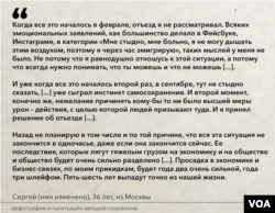 Исследовательский проект «After 24», также попытавшийся обрисовать портрет российского эмигранта февральской волны, пришел к схожим выводам. Согласно опросу***, проведенному весной 2022 года средис 740 уехавших росиян, основными причинами отъезда в феврале «стали несогласие с проводимой Россией внешней политикой» (53%), «тяжелая психологическая обстановка внутри страны» (44%) и «угроза закрытия границ России» (43%). Исследователи подчеркивают: уехавшие в этот период россияне избегали формулировок «беженцы», «эмиграция», «мигрант» – многие участники опроса предпочитали называть сложившуюся ситуацию «просто отъездом».