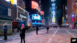 Знаменитая площадь Таймс-сквер в Нью-Йорке, где в новогоднюю ночь обычно собираются тысячи празднующих, на этот раз была почти пуста из-за ограничений, связанных с пандемией коронавируса.
