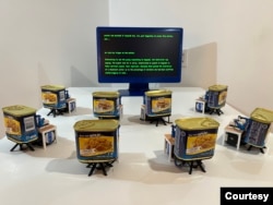 Есть и совсем ироничные объекты: например, фабрика спам-ботов, сделанных художником Нейлом Мендозой из баночек из-под свиной ветчины SPAM, когда-то и давшей название этому явлению. Это жестяные роботы с маленькими ручками, которыми они молотят по клавишам – каждому выдали по 2-3 буквы алфавита. Но вместе они – сила. Они коллективно пишут генерируемый ИИ роман, вдохновленный книгой Олдоса Хаксли «Дивный новый мир», где все действующие лица – свинки, потому что баночки все же помнят о своих корнях.
