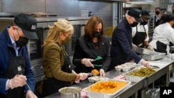 К ним присоединились вице-президент Камала Харрис и ее муж Даг Эмхофф, которые раскладывали зеленую фасоль и подливу.