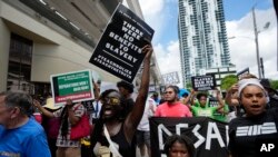 Десятки учителей, учеников и лидеров профсоюзов пришли к зданию школьного совета округа Майами-Дейд в знак протеста против новых стандартов преподавания истории чернокожего населения.
