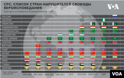 В перечень CPC этого года входят Мьянма, КНДР, Саудовская Аравия, Иран, Эритрея, Таджикистан, Туркменистан, Китай, Пакистан и Россия, в этом году впервые получившая этот статус. USCIRF в своем докладе рекомендовала Госдепартаменту еще больше расширить список: так, в перечень предлагалось вернуть исключенную Нигерию и Вьетнам, добавить Индию и Сирию. Из рекомендаций USCIRF в финальный список была добавлена лишь Россия.