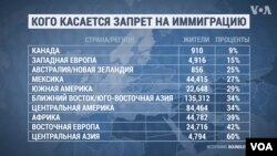 В организации Boundless подсчитали, что введенные ограничения, среди прочего, не позволят получить грин-карты США примерно трети из ежегодного числа заявителей. Это преимущественно коснется жителей Центральной Азии, Африки и Восточной Европы (от 60% до 39%), в то время как жителям Канады, Австралии, Новой Зеландии и стран Западной Европы будет все еще проще получить грин-карты (от 9% до 25% подпадающих под ограничения). При этом, если доля граждан Мексики в процентном соотношении – примерно четверть из подающих документы на грин-карту (27%), то в количественном показателе это 44 тысячи человек – примерно столько же приходится на заявителей со всего африканского континента.