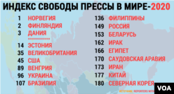 В воскресенье, 3 мая, будет отмечаться Всемирный день свободы прессы. В опубликованном организацией «Репортеры без границ» новом «Индексе свободы прессы» 2020 года подчеркивается, что пандемия covid-19 высветила многие проблемы, угрожающие свободе СМИ. Кроме того, авторы отмечают четкую корреляцию между местом той или иной страны в рейтинге и подавлением свободы слова на фоне пандемии коронавируса. К примеру, в Иране и Китае, идущих в списке на 173-м и 177-м местах соответственно, жестко цензурируют освещение ситуации с пандемией, а Россия, занимающая 149-е место, по словам авторов доклада, использует многочисленные инструменты для контроля информации в Интернете и ведет агрессивные дезинформационные кампании в соцсетях.