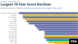 В ежегодном докладе международная правозащитная организация Фридом Хаус (Freedom House), штаб-квартира которой находится в Вашингтоне, сообщает, что в 2017 году демократия столкнулась с самым серьезным кризисом за последнее десятилетие, поскольку ее основные принципы, включая гарантию для свободных и справедливых выборов, права меньшинств, свобода печати и верховенство закона, подверглись нападению во всем мире.