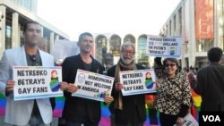 «Гергиев и Нетребко поддерживают антизападную кампанию Владимира Путина – не только против геев и лесбиянок, но и против вообще прав человека, принятых в цивилизованном обществе, – сказала в интервью Русской службе «Голоса Америки» Нина Лонг, со-президент организации RUSA-LGBT, которая объединяет русскоязычных геев и лесбиянок, живущих в США. – Они поддерживают кампанию Путина в России, а потом приезжают сюда, в США, где другие ценности, чтобы пользоваться славой, зарабатывать деньги. Это очень лицемерно. Мы хотим, чтобы каждый раз, когда они сюда приезжают, их встречали протестами».