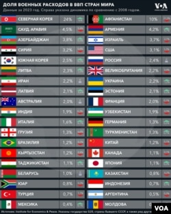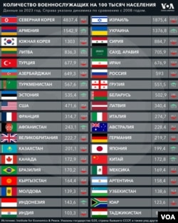 Выделяется по этому показателю и Украина: в 2023 году, в вскоре после начала полномасштабного российского вторжения, на 100 тысяч украинцев приходилось 1376 военнослужащих. В 2008 году этот показатель в стране был в четыре раза меньше (340).