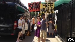 В четверг в Нью-Йорке у здания российского консульства состоялась акция протеста против приговора российскому оппозиционеру Алексею Навальному, который в четверг Кировским судом был приговорен к пяти годам колонии. На изнуряющей жаре – в четверг в Нью-Йорке было более 30 градусов по Цельсию – около 15 активистов стояли у здания на 91-й улице с плакатами, на которых было написано «Позор», «Свободу Навальному» и «Путина – в список Магнитского».