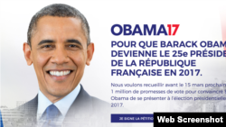 Париж заклеен плакатами «Обама 2017», которые призывают людей зайти на вебсайт инициативы и подписать петицию за то, чтобы бывший президент США мог баллотироваться во Франции.