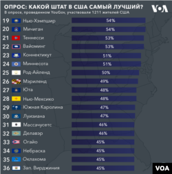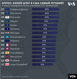 Статистическая служба YouGov поинтересовалась у американцев, какой штат они считают лучшим в стране. Респондентам показывали пары случайно выбранных штатов и предлагали назвать, какой штат им нравится больше.