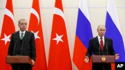 МОСКВА – Встреча в Сочи 3 мая президентов России и Турции прошла при формально-благожелательном отношении друг к другу. Владимир Путин и Реджеп Тайип Эрдоган, выйдя после переговоров к журналистам, рассказали о итогах переговоров, делая комплименты в адрес друг друга.