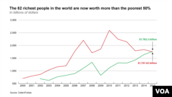 Состояние 62 богатейших людей в мире равно состоянию половины населения мира, поскольку супербогатые стали еще богаче, а бедные еще беднее, сообщила международная благотворительная организация Oxfam.