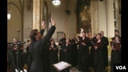 Корреспондент Русской службы «Голоса Америки» Михаил Гуткин побывал на премьерном выступлении хора в католической церкви святого Малахея, известной как «церковь для актеров» и расположенной в театральном районе Манхэттена.