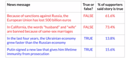 Склонность к «принятию на веру» среди «про-путински настроенных» россиян была изучена в ходе проверки четырех историй, две из которых были чистыми фейками (из-за санкций Евросоюз потерял полтриллиона евро/в Калифорнии слова «муж» и «жена» запрещены из-за однополых браков), а две - правдой.