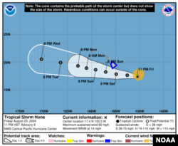 Согласно карте на сайте метеорологического ведомства, утром в субботу на территории округа Гавайи действует предупреждение о тропическом шторме. Округ Гавайи включает в себя одноименный остров, самый крупный в составе архипелага (также он известен под названием Большой остров).