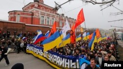 МОСКВА – «Марш мира» против военной агрессии России в Украине, переживающей политический кризис в результате смены власти после многомесячных антиправительственных протестов, собрал тысячи москвичей. Одновременно с антивоенным шествием сторонники Кремля провели акцию «за русскую Украину», формально поддержав аннексию Крыма.