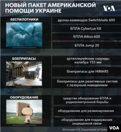 В состав пакета также включены беспилотники Switchblade 600, дополнительные боеприпасы для высокомобильных артиллерийских реактивных систем HIMARS, дополнительные комплeкты артиллерийских снарядов калибра 155 мм, боеприпасы для ракетных систем с лазерным наведением, оборудование для обеспечения защищенной связи, а также финансирование обучения украинских военных.