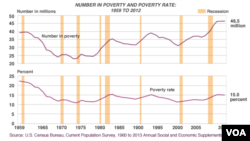 Во вторник Бюро переписи США опубликовало обстоятельный доклад о бедности и доходах населения страны. Он показывает, что семья Изкуердо относится к числу 46,6 миллионов американцев, которые в прошлом году жили на или за чертой бедности – это 23,550 долларов для семьи из четырех человек. Новые данные переписи практически не отличаются от данных года предыдущего. Исследователи говорят, что США все еще пытается восстановиться после 2007 года – года перед экономическим спадом.