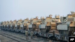 Среди прибывающей техники танки «М-1 Абрамс» и боевые машины «Бэрдли» из 2-й бригадной боевой группы 1-й кавалерийской дивизии, базирующейся в Форд-Худе, штат Техас.